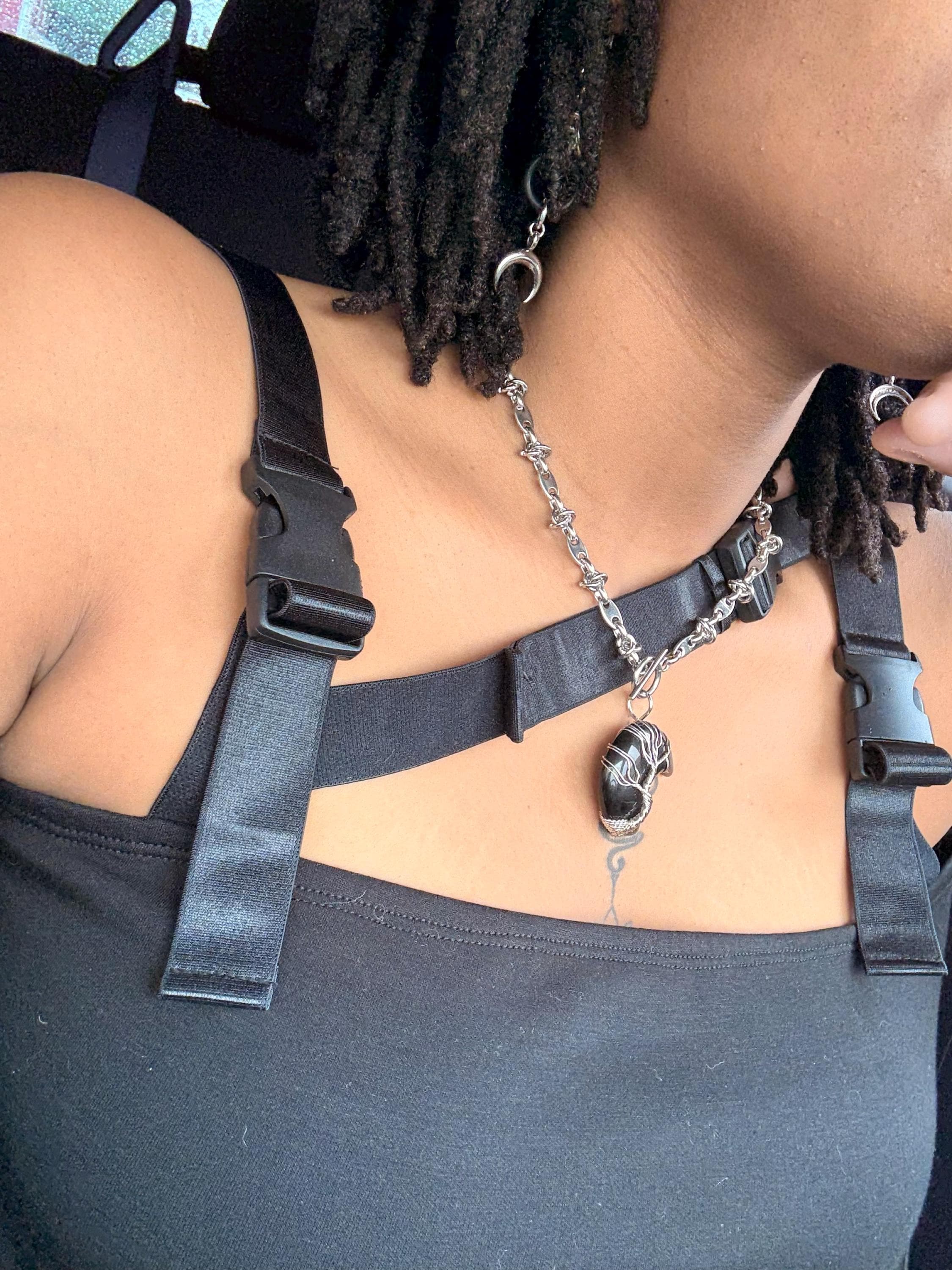 Moon-shaped stainless steel and onyx chain mail necklace.