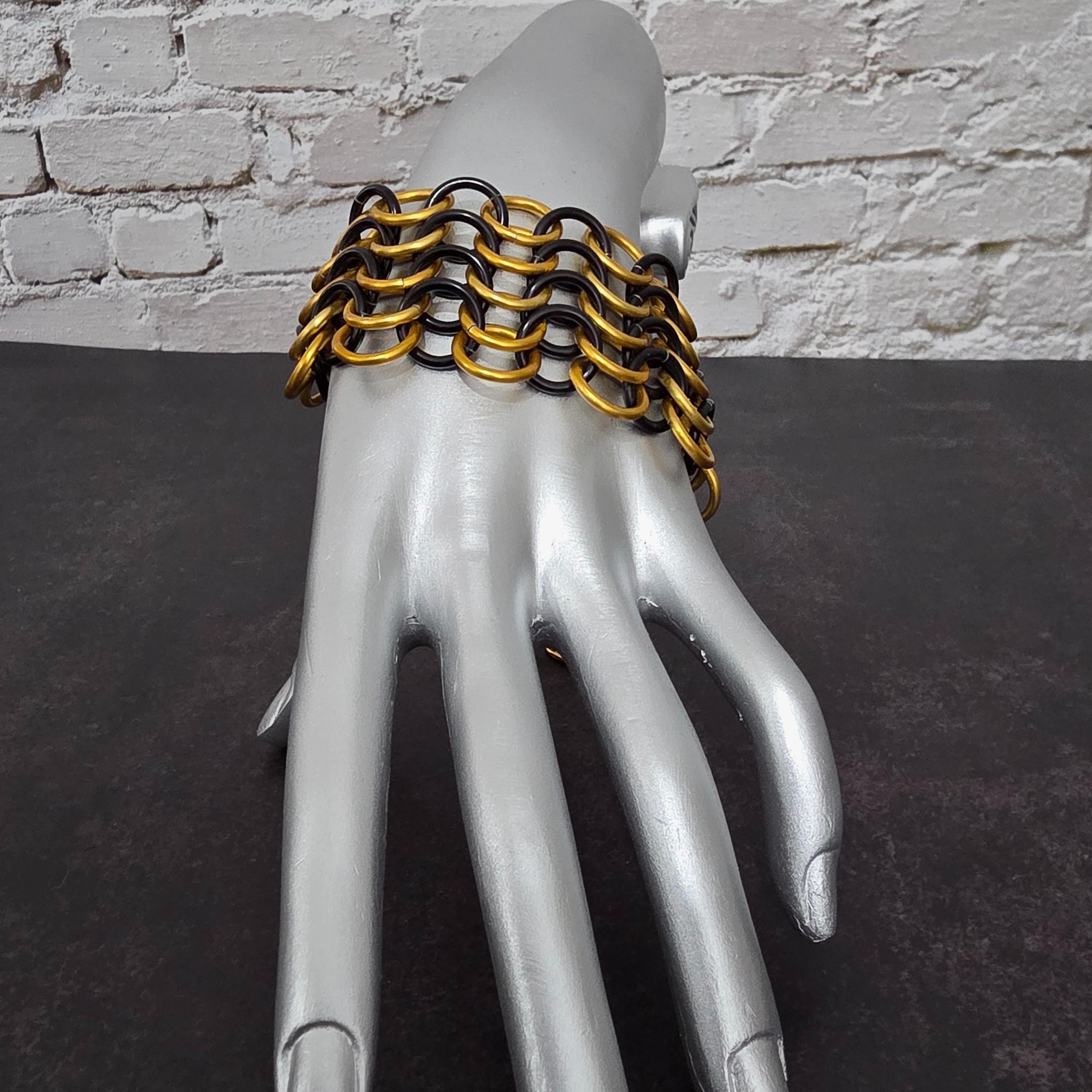 Bracelet en cotte de mailles artisanale, entièrement réalisé à la main, anneau par anneau, à partir d’anneaux en aluminium noir et or.