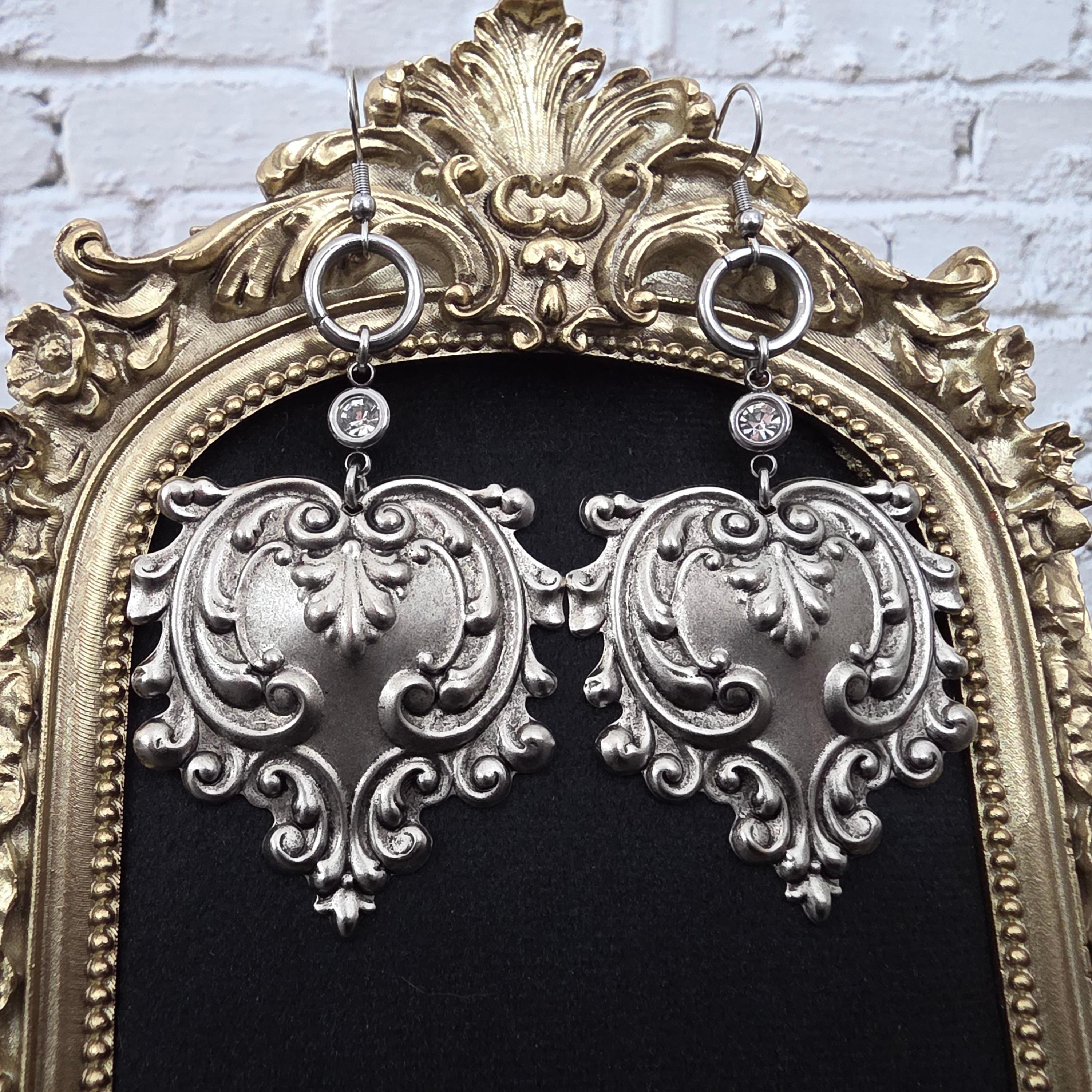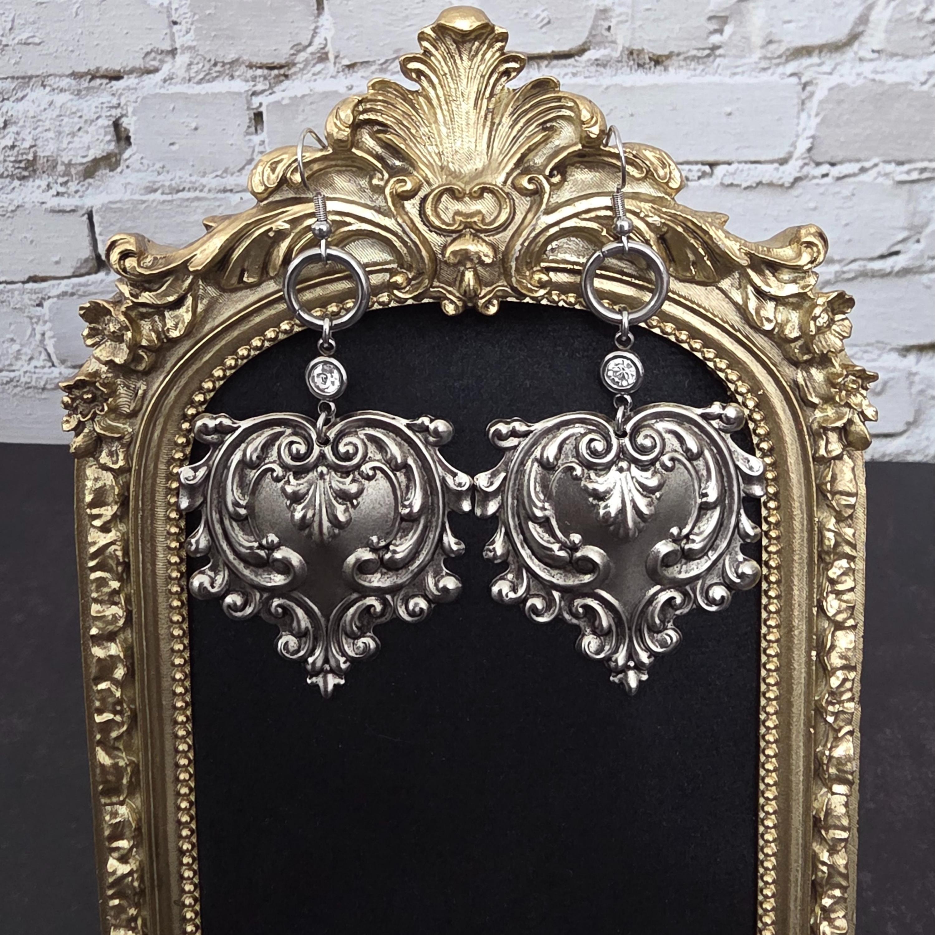Boucles d’oreilles cœur baroque argent antique – Boucles pendantes gothiques élégantes – Bijou artisanal statement